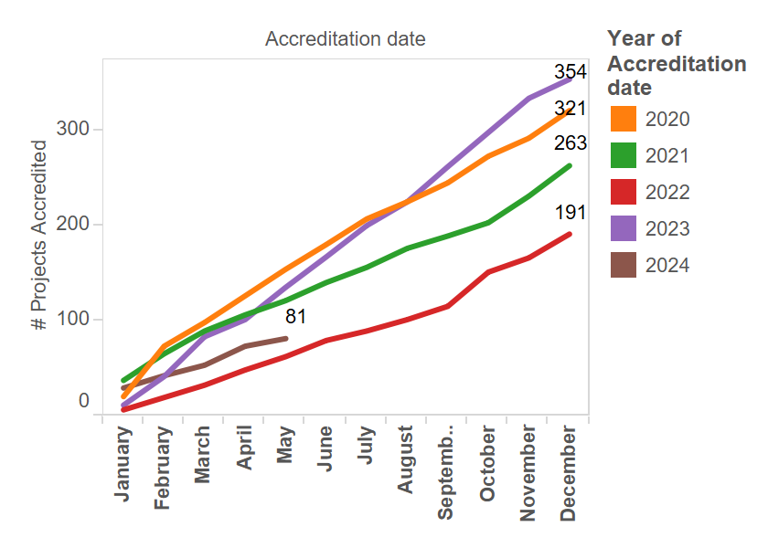 However in 2024 YTD there are far fewer projects that have been accredited by the CER when compared to last year. The reason is likely to be processing hold-ups in the CER – something that affected last year’s figures too.OVERALL THE LGC MARKET IN A HEALTHY STATE CUMULATIVE # SOLAR LGC PROJECTS BY YEAR FIRST ACCREDITED