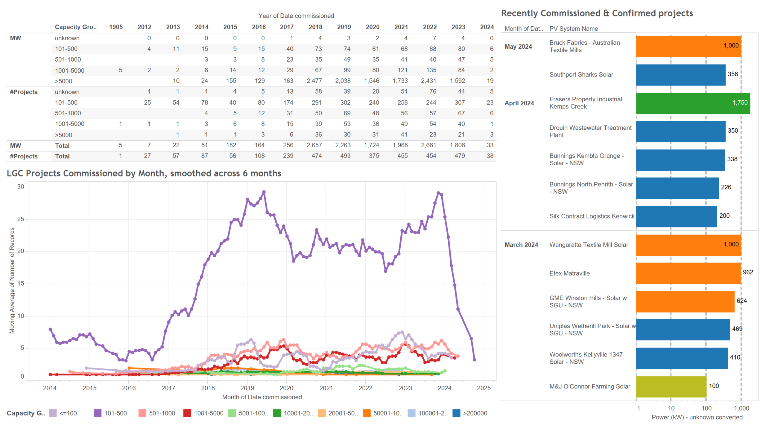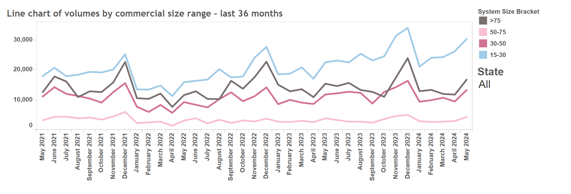 Driving the record start to the year is ongoing growth in the 15-30kW range. By contrast, other STC commercial size ranges haven’t been growing. That may have changed in May 2024, which saw a substantial uptick in the all STC commercial size ranges.
