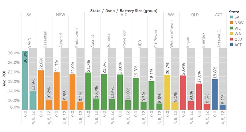 Johnston says: “This chart compares the non-battery ROI vs the average ROI with a battery in each DNSP. ROI is highest in SA, both for PV-only and PV-storage.