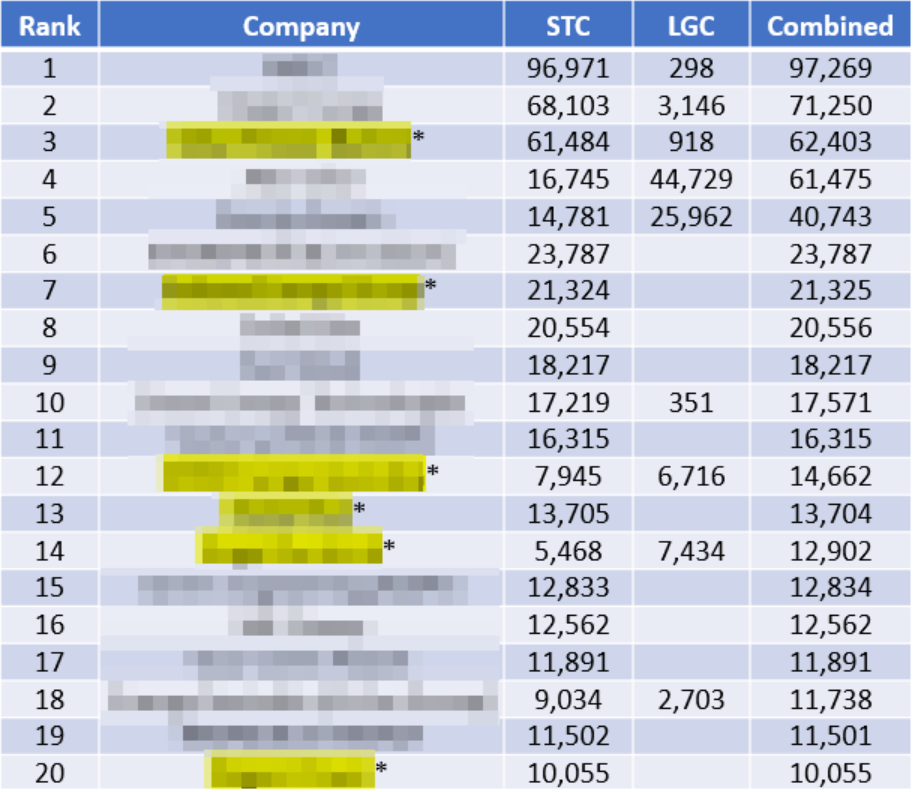 • There was some significant shifting in the ranks for commercial PV. The combined STC and LGC volume of some commercial specialists like AGL & EnergyAware was enough to leapfrog many pure-play residential retailers and rank companies in the Top 10 companies overall. (Many of the companies listed below owe their appearance in the league table to reporting data to SunWiz)