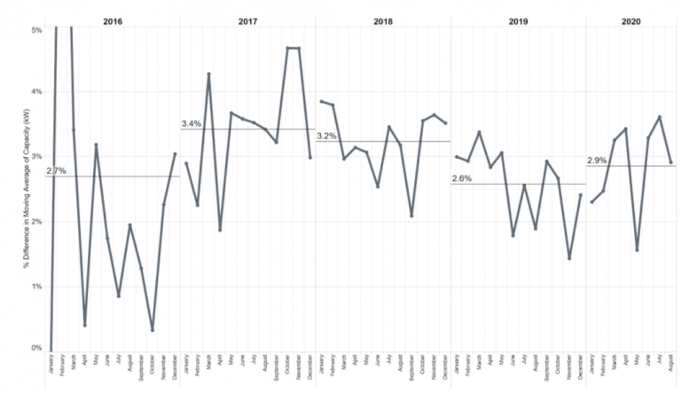In this chart, we’ve compounded the month-over-month growth rate of the Australian PV market for the past years, and plotted the annual averages. As you can see, the capacity installed has been steadily increasing at a rate of roughly 3% year over year.