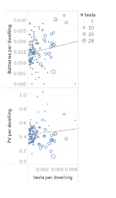We ran some interesting analysis comparing the number of Tesla EV’s compared to the number of PV systems and number of ESS, normalised on a per-dwelling basis.