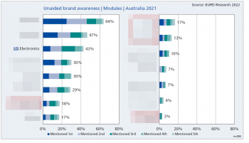SunWiz’s MarketView (Panels) report – which relies on anonymised retailer’s account level data – indicates LG Energy held 5% market share for the month of January 2022 (7% over 2021) and ranked equal ninth nationally. The relative size amongst quality panel players can also be seen in the right chart, which shows LG held a leading but not dominant position amongst manufacturers of top-quality panels.