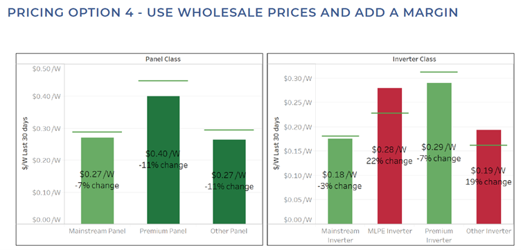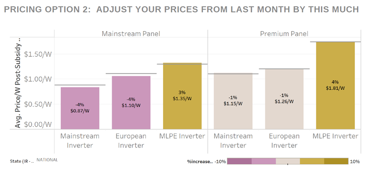 The key thing with prices is they are always changing. LuminateSME also shows you how prices have changed in the recent month. As illustrated below, the typical price of systems using mainstream panels with mainstream inverters went down by 4%, whereas the typical price of a premium panel with MLPE went up by 4%.